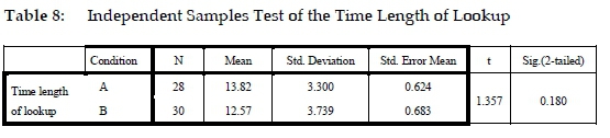 Table 8 shows that the average time length of dictionary consultation was 13.82 minutes in Condition A and 12.57 minutes in Condition B. The results of an independent sample T-test revealed no significant difference between the two conditions (p = 0.180 > 0.05).