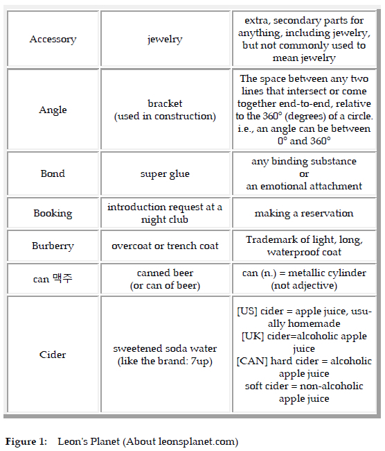 Moreover, prospective teachers can be exposed to further linguistic categories regarding lexis, which apply to all languages of course; this can further be deployed for their future (or current) students. That some of the online dictionaries provide such information is an added benefit, referring to categories such as clipping and semantic shift. An interesting feature of Choi's dictionary is the inclusion of the word 'real' in the context of 'the real meaning in Korea'. This might not appear to be of particular importance, but it arguably suggests that in this context, word meanings in Korea take precedence - as they should - regardless of the origins of a given word. Hence, the word white in Korean English is as meaningful as are its counterparts in countries such as the USA and UK, which would respectively use words such as whiteout and Tipp-ex. Here, then, are examples of three Englishes for the price of one, and initiated with the inclusion of an online dictionary in the classroom. Likewise, the word saida (cider) refers to a drink in Korea similar to 7-UP, but in the UK cider is an alcoholic beverage made from apples, whereas in the US it is non-alcoholic.