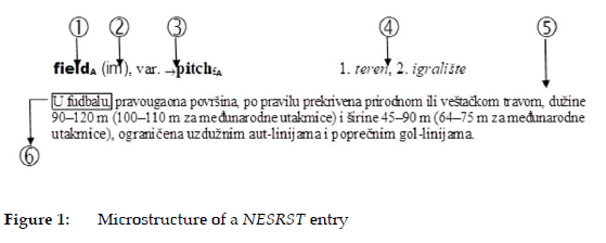 A typical NESRST entry consists of six elements, which are described and exemplified in the User's Guide: English term (1), grammatical information (2), cross references (3), Serbian term(s) (4), gloss (5), and diatechnical label (6). The numbered elements are shown in Figure 1 below (NESRST, 160). To distinguish between English and Serbian terms used for exemplification in the text, the former is written in italics and the latter in small capitals, with the symbol > in between, to mark the direction of adaptation from English into Serbian.