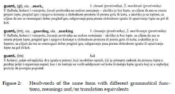 Even though NESRST is based on the existing model, theoretically elaborated in Milić (2004) and practically realized in Milić (2006), it could not fit the substantially increased lexical inventory of the new dictionary. Thus, the inclusion of new sports registers has brought to light eight problems related to the morphosyntax of headwords, the adaptation of Japanese-based and gymnastics terms from English into Serbian, and the applied dictionary medium. In the following sections, the problems are elaborated on and exemplified by representative NESRST entries.