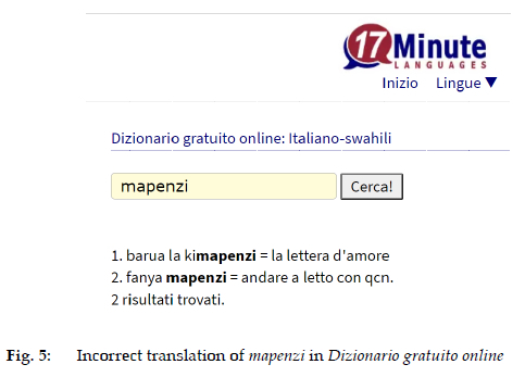 (3) 17minute-languages - Dizionario gratuito online: Italiano-swahili (https://www.17-minute-languages.com/it/dizionario-di-swahili/), which allows the search for SWA-IT and IT-SWA and works as an automatic translator offering a list of the sentences containing (in the Italian translation) the searched word or form. The results are sometimes incorrect or lacking the main, basic translation as, for instance, in fig. 4, showing the result for the word 'amore' (love). Here we don't find the main Swahili translations for 'amore' (mapenzi, mahaba, upendo) but two examples: (1) barua la (sic!) kimapenzi = la lettera d'amore (love letter), where the Swahili word mapenzi is used in a particular way, namely with a ki- prefix with an attributive function; (2) sikitika = soffrire le pene d'amore (to suffer the pains of love). Actually, the Swahili verb sikitika means 'to be sorry, to be sad', which clearly was translated into Italian as 'soffrire le pene d'amore' in a specific context.