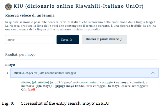 The Swahili-Italian dictionary is designed primarily as a didactic tool for Swahili students, but at the same time it is suitable for a wider audience, including people working for Italian NGOs, staff of cultural associations and institutions, embassy staff, tourists, businessmen and anyone interested in Swahili language and culture. While there are very few lexical resources available for Italian L1 Swahili students, this online dictionary will serve as a language-learning support and supplement other teaching materials and paper-dictionaries used in class. The dictionary KIU will be published online on a dedicated website linked to the UniOr website,6 and will be accessible for free to university students and the general public.