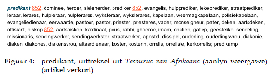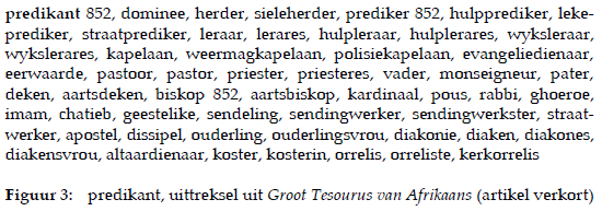 Daar bestaan nuanseverskille tussen byvoorbeeld 'n sieleherder en 'n prediker, 'n hulpprediker en 'n lekeprediker, 'n straatprediker en 'n leraar, 'n wykslerares en 'n kapelaan, en 'n evangeliedienaar en 'n eerwaarde. Dit is 'n voorbeeld van semanties verwante woorde wat langs mekaar gegroepeer word en met behulp van kommas van mekaar geskei word. Dit laat die gebruiker onder die indruk dat hulle naby-sinonieme of sinonieme is, terwyl dit nie die geval is nie. 'n Gebrek aan konteksleiding veroorsaak dat gebrekkige inligtingsoordrag plaasvind en dat die gebruiker nie voldoende leiding ontvang nie.