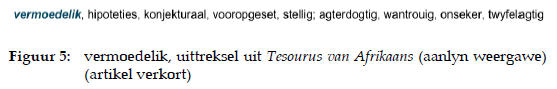 Vergelyk die hantering van vermoedelik in die subparagraaf onder die artikel glo in TA, wat binne vier stappe tot die teenstellings agterdogtig, wantrouig, onseker, twyfelagtig lei. Die semantiese teenstelling volg na 'n kommapunt as struktuurmerker.