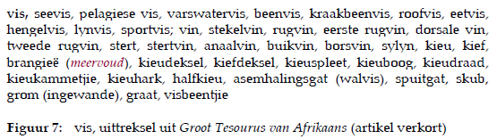 Die eerste 11 inskrywings kan as naby-sinonieme van die woord vis beskou word en die volgende inskrywings, geskei deur 'n kommapunt, eerder as dele van 'n vis se anatomie. Daar word nie duidelike kontekstuele leiding ten opsigte van die hiponimiese betrekking tussen die leksikale items in die artikel, maar ook in ander artikels, byvoorbeeld vissery en seekos, aan die gebruiker verskaf nie. Daar is ook nie 'n verwysing na die uitdrukking nóg vis, nóg vlees, wat onder die artikel bestaanswyse voorkom, nie. Die volledige netwerk van semantiese betrekkinge tussen die leksikale items word dus nie vir die gebruiker duidelik nie.