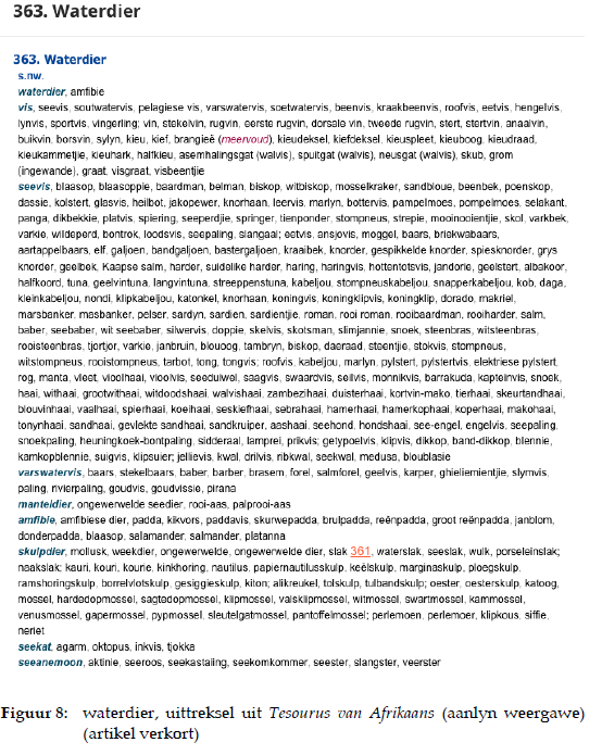 By nadere ondersoek blyk dit dat die artikel hersien is, met 12 subordinate wat gelys word. Die sinoniem amfibie is bygevoeg en die volgorde het verander na vis, seevis, varswatervis, manteldier, amfibie, skulpdier, seekat, seeanemoon, koraal, seewurm, strandluis en watersoogdiere. Die nuwe volgorde van verskillende kategorieë vissoorte kan as 'n verbetering beskou word deurdat dit semantiese konsepte wat nader aan mekaar is en meer natuurlik op mekaar volg na aan mekaar geplaas is. Ter illustrasie van die verbetering kan vis, wat as hiponiem vir die volgende optree, verder ontleed word: seevis, soutwatervis, pelagiese vis, varswatervis, soetwatervis, beenvis, kraakbeenvis, roofvis, eetvis, hengelvis, lynvis, sportvis, vingerling. 'n Kommapunt skei die volgende inskrywing wat eerder 'n deel-van-verhouding uitbeeld, naamlik vin, stekelvin, rugvin, eerste rugvin, dorsale vin, tweede rugvin, stert, stertvin, anaalvin, buikvin, borsvin, sylyn, kieu, kief, brangieë (meervoud), kieudeksel, kiefdeksel, kieuspleet, kieuboog, kieudraad, kieukammetjie, kieuhark, halfkieu, asemhalingsgat (walvis), spuitgat (walvis), neusgat (walvis), skub, grom (ingewande), graat, visgraat, visbeentjie. Hierdie artikel lys dus eerder hiponimiese betrekkinge tussen woorde as sinonimiese betrekkinge. Konteksleiding ontbreek egter om 'n volledige oordrag van semantiese betrekkinge tussen woorde te illustreer.