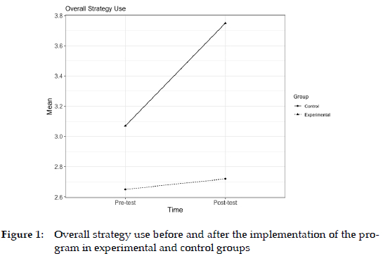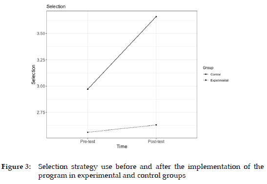 Selection strategy use: Both groups were initially comparable in selection strategy use with a Mean Difference of 0.410, p = 0.07 (see Table 1 and Figure 3). A significant interaction between group and time was noted (F(1, 148) = 21.101, p< 0.001, n2 = 0.125). The control group maintained their strategy use after the implementation of the program (Mean Difference = 0.065, p = 0.500), whereas the experimental group reported increased use (Mean Difference = 0.688, p< 0.001).