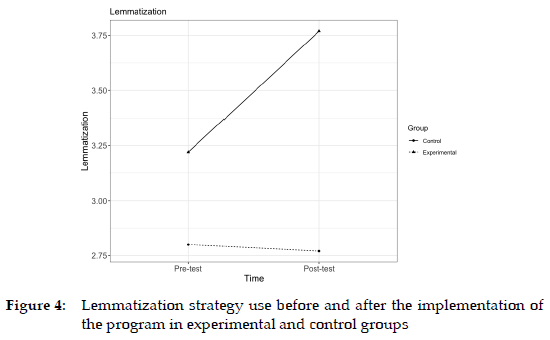 Lemmatization strategy use: As presented in Table 1 and Figure 4, lemmatization strategies were consistent across groups before the implementation of the program (Mean Difference = 0.417, p = 0.07). A significant interaction was detected after the implementation of the program (F(1, 148) = 19.744, p< 0.001, n2 = 0.117). The control group's strategy use remained stable (Mean Difference = 0.029, p = 0.756), while the experimental group showed a marked increase (Mean Difference = 0.55, p< 0.001).
