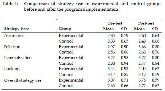As illustrated in Table 1, the mean scores and standard deviations for each strategy type - awareness, selection, lemmatization, and look-up - were compared between the experimental and control groups both before and after the program's implementation.