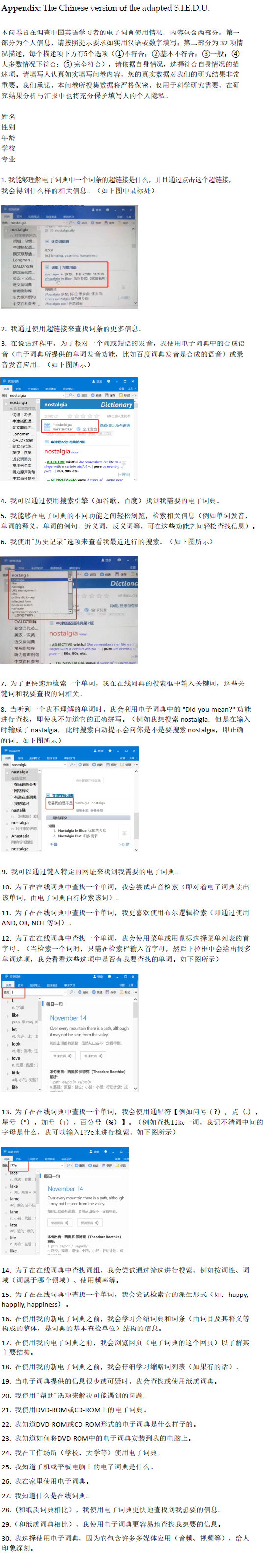 To refine the Chinese version of the S.I.E.D.U., a pilot test was conducted with ten English majors to identify any unclear words, phrases, or sentences in the questionnaire. Eight students encountered a common issue, i.e. uncertainty regarding certain technical terms, such as "词条" (entry), "词域" (field), (wildcards), and "通配符" (Boolean search). Additionally, six students expressed uncertainty about understanding the intention of specific items, such as Item 15 "To find a word in an online dictionary, I use the menu or select the first letter of a menu list using the mouse". They were unsure about the origin of the menu list mentioned in the item. In response to the feedback from the pilot study, the group of specialists decided to enhance clarity by providing explanations for these technical terms and even including screenshots of certain examples to offer further clarification. For example, we added an explanation of 当检索一个词时,只需在检索栏输入首字母,然后下拉框中会给出很多单词选项,我会 看看这些选项中是否有我要查找的单词。如下图所示" to Item 15 (see Appendix for more information). Additionally, for items that remained unclear, the specialists incorporated examples to show how certain functions work. To ensure comprehensive understanding, five additional English majors were invited to review the content of the Chinese version and assess their comprehension of all items' meanings and intentions. After thorough review and confirmation, it was necessary to intentionally disrupt the order of all the items as well. Following this adjustment, the Chinese version of the S.I.E.D.U. was finalized. This proactive approach aimed to improve the comprehensibility and reliability of the questionnaire, ensuring accurate data collection in the subsequent phases of the study.