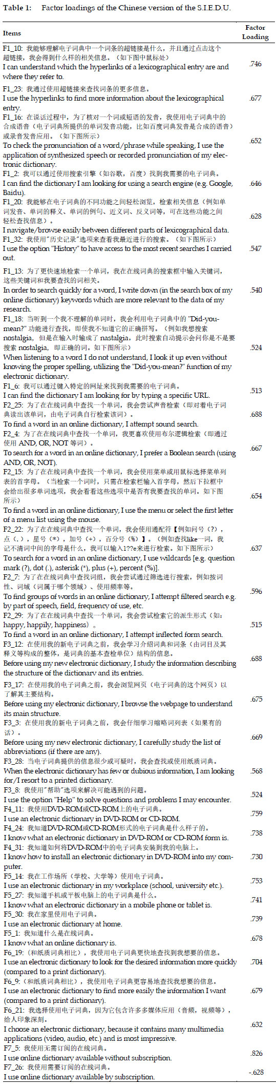 in subsequent research endeavors to bolster its reliability and validity. Furthermore, they call for its translation and cultural adaptation into other languages. However, there exists a notable gap in the availability of an instrument specifically tailored to gauge Chinese learners' strategies for ED use. Adaptation and validation of the S.I.E.D.U. to assess Chinese learners' ED strategies are imperative for several reasons. Firstly, while numerous studies have delved into ED use and reference skills (e.g. Campoy-Cubillo 2021; Klein 2008; Krajka 2015; Pastor and Alcina 2010), relatively few have examined ED strategies from learners' perspectives. Comparing the results of these studies with learners' perceptions of their lookup process poses a challenge. Learners may lack awareness of the strategies they employ or the strategies they need to improve their ED consultation practices. Therefore, understanding learners' perspectives on ED strategies is essential for enhancing their use of ED effectively. Secondly, the present study, focusing on the appropriate adaptation protocol, aims to optimize the reliability and validity of the S.I.E.D.U. in the Chinese context. Although the S.I.E.D.U. was initially tailored for Greek learners, this adaptation aims to assess the applicability of the S.I.E.D.U. in examining electronic dictionary use strategies (ED use strategies) not only among Greek learners but also for learners from other cultures, demonstrating its general utility. Additionally, it seeks to provide valuable insights for learners and educators, thereby enriching pedagogical lexicography in a broader context.