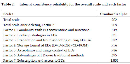 The first factor, comprising 26.663% of the total variance, encompasses nine items pertaining to users' familiarity with ED conventions and functions. Accordingly, it was labeled as "Familiarity with ED conventions and functions". The second factor, explaining 13.183% of the variance, encompasses six items focusing on users' proficiency in utilizing specific functions offered by EDs. This factor was designated as "Look-up strategies in EDs". The third factor, contributing 6.113% to the total variance, comprises five items related to users' preparation before utilizing an ED and their problem-solving approaches when encountering difficulties. This factor was labeled "Preparation and troubleshooting during ED use". The fourth factor, explaining 4.013% of the variance, consists of three items concerning the storage format of EDs, specifically whether it can be gained from DVD-ROM or CD-ROM. It was labeled "Storage format of EDs (DVD-ROM/CD-ROM)". The fifth factor, contributing 3.868% to the total variance, encompasses four items related to users' overall acceptance of EDs and the contexts in which they are utilized, earning the label "Acceptance and usage context of EDs". The sixth factor, explaining 3.709% of the variance, comprises three items focusing on the advantages that EDs offer over traditional paper dictionaries. This factor was designated "Advantages of ED over traditional methods". Lastly, the seventh factor, accounting for 3.431% of the variance, consists of two items associated with users' subscriptions to ED services. It was labeled "Subscription and access to EDs".