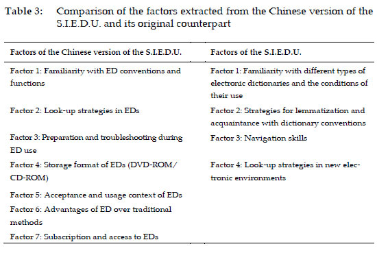 In contrast to the four factors identified in the S.I.E.D.U., the Chinese version revealed seven distinct factors. Within these seven factors, both commonalities and differences emerged when comparing the findings of the two versions (see Table 3). It was noted that the four factors derived from the original study exhibit some degree of overlap. Specifically, factors 1 and 2 pertain to ED conventions, while factors 3 and 4 delve into learners' reference skills and strategies employed during ED consultations.