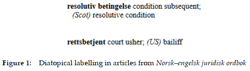 The articles in Figure 1 are from a Norwegian-English dictionary of law that has translators, interpreters, lawyers, and others who need to transpose Norwegian legal terminology to English as its intended user group. The labels, presented in abbreviated form (Scot for Scotland, and US for USA), help translators to select the correct equivalent in a given situation by indicating in which contexts they may be appropriate. The purpose of diatopical labels as context markers in legal translation dictionaries is twofold: They indicate which regional language variant equivalents belong to and, perhaps more importantly, which legal jurisdiction equivalents belong to. This duality is directly linked to the culture-bound nature of legal jurisdictions, concepts, and terms as well as their languages. Dictionaries translating into English present lexicographers with the challenge that English has many variants depending on the legal jurisdictions that form the context of equivalents, and Norsk-engelsk juridisk ordbok uses 8 diatopical labels relating to the following jurisdictions: America (USA), Australia, England and Wales, European Union, Ireland, Norway, Northern Ireland, and Scotland.