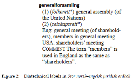 The diatechnical labels found in Figure 2 show that legal dictionaries may have to present contexts that are specific for different sub-fields of law. The article is from a Norwegian-English law dictionary intended for Norwegian lawyers, translators, businesspeople, teachers, and public administrators who need to communicate about Norwegian legal matters in English. Figure 2 explains that the translation of the Norwegian term (or rather two concepts) generalforsamling should be translated according to the sub-field context in which it/they occur. The first context is indicated as folkerett (i.e. public international law) and the other as selskapsrett (i.e., company law) so that translators can select the appropriate English equivalent. At the same time, the article contains the diatopic labels Eng and USA to make translators explicitly aware of restrictions in the context of use. Finally, Figure 2 includes a comment informing users of two synonyms used in legal contexts, a comment that is addressed to the context labelled company law.