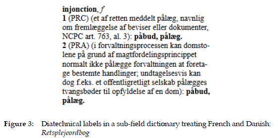 Figure 3 shows an article from the French-Danish section of a quadrilingual judicial dictionary that treats the sub-field law of procedure (i.e. the administration of justice), covering terms in English, French and German-speaking jurisdictions in the European Union and their Danish translations. Procedural law is often divided into two, or in the case of France three, broad sub-sub-fields, namely civil procedure, criminal procedure, and administrative procedure. The first context in which the French injonction occurs is civil procedure (indicated by PRC = procédure civile), whereas the second context is administrative procedure (indicated by PRA = procédure administrative). In this article, the context markers are addressed to the lemma and, in addition to the abbreviated labels, the contexts are provided by explicit definitions in Danish to cater for the intended Danish users. The definitions provide knowledge-related context and the boldface, Danish equivalents provide translation assistance. Finally, context is also provided by the reference to a source outside the dictionary (NCPC art. 763, al. 3), which is a reference to Article 763, point 3 of the Nouveau Code de Procédure Civile, where further details and context may be found. Another example of context in dictionaries appears in Figure 4.