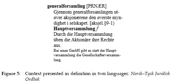Lexicographers may provide extended context by presenting definitions in both the source and the target language. This type of contextual presentation may assist translators in two ways: the source-language definition helps users to establish whether they have found the correct dictionary article to check that the meaning of the lemma matches that in the source text; secondly, the target-language definition may help users with translation-relevant context in that it helps users translate or otherwise communicate about a source-language term in the target language. One example of this type of context is found in Figure 5, which contains an article from a Norwegian-German dictionary of law with professional translators, lawyers, and students as its intended user group.