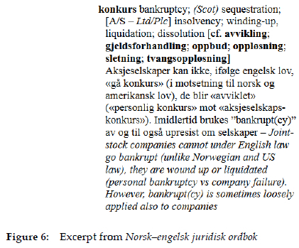 The article in Figure 6 is intended to help translators, interpreters, lawyers, and others translate Norwegian legal texts into English and the lexicographer has opted for presenting context that matches the profiles of the intended users. Firstly, the article contains several English equivalents: an unmarked equivalent (bankruptcy); a Scottish equivalent (sequestration) marked by a diatopical label; and four equivalents that are labelled as belonging to companies (A/S and Ltd/Plc). The interpretation of the label Ltd/Plc requires some knowledge on the part users as it refers to two corporate entities in the UK jurisdiction. Secondly, the equivalents are followed by cross-references in square brackets to six Norwegian terms where users may find additional contextual and translation-relevant data. Thirdly, the article explains in Norwegian that the term konkurs applies to both personal insolvency and company insolvency in contrast to the UK legal system, where the rules and terminology relating to personal and company insolvency differ. The legal-systemic data also explains that the Norwegian concept of konkurs is more like the US legal system. In addition, the English term bankruptcy is often loosely used to refer to both personal and company insolvency. Finally, the contextual data on legal-systemic differences is presented in both Norwegian and English, which may help users understand the differences as well as help users communicate about these differences in English. The contextual data in the article are thus related to the overall contexts of scope, function, and use.
