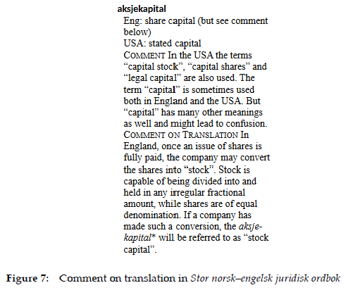 The explicit comment on translation in Figure 7 concerns the translation of the Norwegian term aksjekapital into British English (Eng) and combines a legal and a translation context. The lexicographer thus provides an extra-lexicographic context by explaining elements of substantive law (diatechnical dimension) and a use context by helping translators selecting the appropriate term. These contexts are aligned with the dictionary's user group in terms of factual and language competences when translating legal texts, i.e. user needs. An English-Danish law dictionary whose user group is legal translators, other translators, interpreters, lawyers, the business community, and students provides help to translation in very specific parts of the translation process (Figure 8).