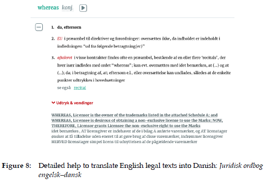 The article in Figure 8 addresses context in several ways. Firstly, it concerns the conjunction whereas and presents three contexts: one unmarked, general translation option; one restricted to a European Union context (EU); and one restricted to contract law (aftaleret). Secondly, the data contained in the comment on EU translation explains that in the preamble of directives and regulations, the English conjunction whereas is not translated into Danish because the meaning of the conjunction is contained in the Danish introduction by the phrase "ud fra følgende betragtning(er)" (i.e. based on the following consideration(s)). This reference to the dictionary-external world indicates that the wording in specific text genres is structured differently in English and Danish within the same genre and the same supranational jurisdiction. Thirdly, the context provided for meaning 3 explains that English contracts often contain preambles with recitals introduced by the conjunction whereas and that the English conjunction can be translated in several ways, including non-translation if the Danish translator uses main clauses instead of conjunctions. Finally, the article contains an English example sentence from a contract and its Danish translation (Udtryk & vendinger), which explicitly shows how to translate the English conjunction whereas and the remainder example text into Danish by using main clauses. Example sentences like this illustrate usage in legal contexts at the level above words, terms, and phrases with a direct link to translation.