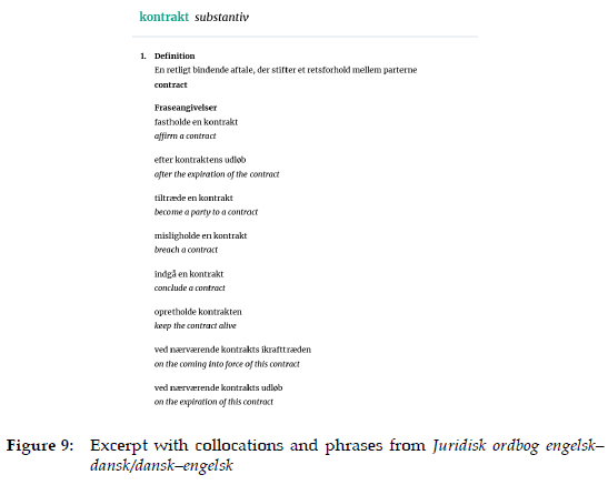 Figure 9 illustrates how a Danish-English legal translation dictionary intended for Danish translators, lawyers and students presents Danish word combinations and their translations into English. In addition to a definition in Danish and the boldface translation equivalent, the article contains a total of 14 Danish collocations with their English translations, such as affirm a contract and conclude a contract, and phrases, such as on the coming into force of this contract and on the expiration of this contract. The last two phrases show, for instance, that the Danish and English word order is different (compare the placing of the terms kontrakt and contract), and prevents the use of false friends, in that the Danish preposition ved generally corresponds to the English prepositions with and by, but the English preposition on has to be used when translating the legal phrases. This illustrates an important aspect of specialised translation, as explained by Gerzymisch-Arbogast (2008: 30): "It is the whole unit of such lexical expressions that the translator has to identify and transport to another textual environment." Therefore, translators will benefit from legal translation dictionaries containing such phrases.