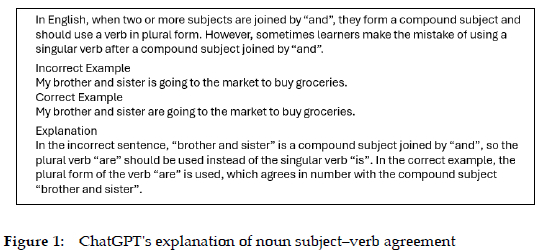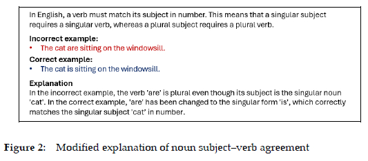 In other cases, the example sentences also contained unnecessary wording that could distract learners from the real issue. An example of this is when ChatGPT was asked to explain the incorrect use of a singular verb with a plural noun as subject: