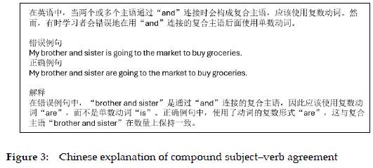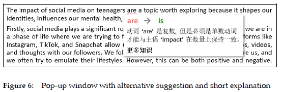 The final destination of the explanations discussed in the previous sections is their integration into a bilingual English writing assistant, similar to the bilingual Spanish one presented by Li et al. (2024), but different from theirs in that it is aimed exclusively at Chinese learners of English. The writing assistant will be supported by an AI-powered language model that has been trained to detect errors in written English. The idea is that beginner and intermediate learners can either paste their English texts into the tool or use it to write them, as in Chinese apps of the 1-7 Zuoye type, albeit with different functionality. The writing assistant will then highlight possible problems in the text. If the learner does not know why a particular word has been highlighted, he or she can simply click on the word in question to display a pop-up window with an alternative suggestion followed by a short explanation (see Figure 6). As can be seen, the problem in this case is noun subject-verb disagreement. Accordingly, the short Chinese text reads: