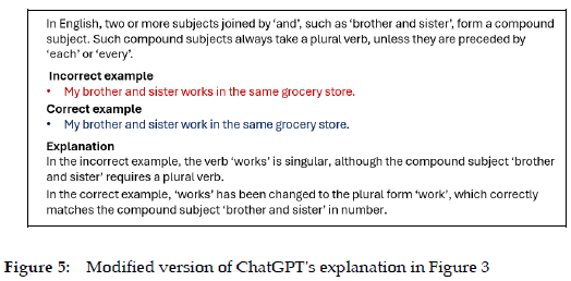 As can be seen in Figure 4, there are some good points in ChatGPT's response, especially the initial explanation of what is meant by compound subject and what this type of subject requires of the paired verb in terms of number. However, given its intended audience and genre-specific purpose, there are several things that could and should be improved, as a comparison with the edited explanation in Figure 5 will clearly show. Firstly, there is some distracting "noise" that should be removed, such as the superfluous sentence beginning "However..." in the introduction and the redundant repetition of the definition of a compound subject in the final explanation. Secondly, the compound subject brother and sister used in the example sentences has been inserted into the definition of this grammatical category to illustrate what it refers to. Thirdly, the only two words (each and every) that override the general rule when they precede a compound subject are briefly mentioned. Fourthly, the argumentation structure in the final explanation has been made more logical and straightforward, similar to the refinement of the explanation in Figure 2. As the cherry on the cake, the two example sentences have also been modified, although this was not strictly necessary. The intention behind this move was simply to use a verb other than to be, as it turned out to be quite easy to come up with an alternative inspired by the words groceries and market in the original examples. Figure 5 shows the result of this careful editing, always keeping in mind the specific purpose and anticipated target users.