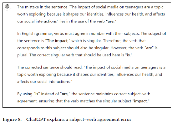 This new approach is driven not only by improved language models, but also by the integration of generative AI into the writing tool to support its functionality. To explore these new technological advances in the current borderland between the possible and the impossible, ChatGPT was asked to explain why it is a mistake to use the verb form are, highlighted as an error by the language model, in the sentence partially covered in Figures 6 and 7. Its response is shown in Figure 8, and as can be seen, it was perfectly able to identify both the subject (impact) and its number (singular) and compare it with the number (plural) of the verb (are), and on this basis explain the grammatical problem at hand.