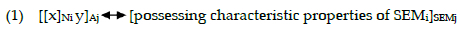 The double arrow in the schema (1) symbolises the correspondence between form and meaning. The variable x denotes the phonological form of the noun. Co-indexation indicates that the semantic representation (SEM) of the noun is embedded within the meaning of the corresponding adjective. This schema assumes an independently specified semantic representation of the noun, thus highlighting that the schema itself is grounded in paradigmatic relations among lexical items. The variables i and j stand for the lexical indexes on the phonological and syntactic properties of words.