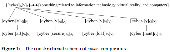 In CxM, word formation is analysed through hierarchical constructional schemas that reflect systematic form-meaning correspondences. Using cyber- as an example, the unified schema [[cyber]X[y]Y]Y governs its overall combinatory potential, where cyber- combines another element y to form a lexeme that belongs to the word class Y. In accordance with the analysis in Section 5.4.2, cyber- has acquired three meanings so far. Therefore, the schema of cyber- can express the meaning of "something related to information technology, virtual reality, and computers". At a more specific level, this general schema branches into [cyber-[y]Ni]Nj (94 instances, e.g., cyberart), [cyber-[y]Ai]Aj (4 instances, e.g., cybersecure), [cyber-[y]Vi]Vj (5 instances, e.g., cyberloaf), and [cyber-[y]Ci]Nj (4 instances, e.g., cybernaut). Each of these schemas represents a distinct form-meaning pairing, with the lower-level schemas inheriting properties from the more abstract schema. This hierarchical structure demonstrates how CxM accounts for both consistency and variation in the formation of new CF compounds.