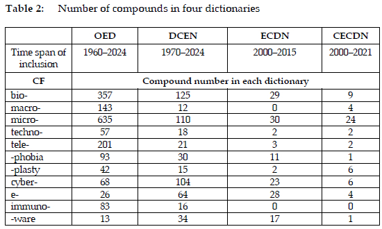 Both qualitative and quantitative methods can be used to assess productivity. This paper adopts the quantitative measure and counts the number of new compounds included in dictionaries over specific periods to analyse the productivity of CFs in forming new compounds. Counting the number of new words in a given phase is a measure of productivity (Plag 2021: 489). However, the use of dictionaries is not immune from problems. As Bauer (2001: 158-159) notes, consuiting a dictionary provides a conservative idea about what is 'part of the language' by often excluding neologisms, rare words, and established words deemed invaluable to the target audience.