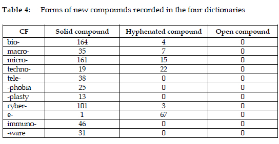 Each of the CFs was searched in the OED. The OED records all the said word-forming elements as CFs, except -ware. The OED provides the section of "compounds and derived words" for the CFs, and the types of formation are also indicated. In the case of bio-, its formations included in the OED are 357 compounds, 6 derivatives, and 4 borrowings. The numbers of compounds formed with the CFs covered in the OED are listed in Table 2. The numbers of compounds in the three neologism dictionaries are also investigated, as is shown below.
