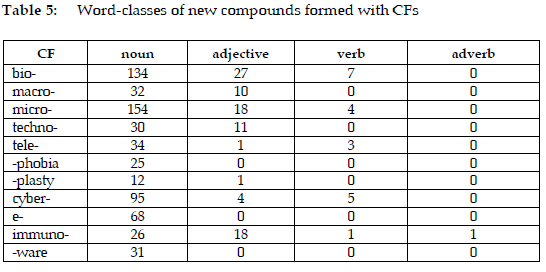 The data in Table 5 demonstrate that the majority of new CF compounds are nouns. CFs such as bio-, micro-, and cyber- are particularly productive in forming noun compounds. Examples include biocapacity, microangiography, and cyber-security. Adjective compounds (e.g., immunoregulatory and microaerobic), while less common, are still notable, with CFs like bio-, micro-, and immuno- forming over 15 adjectives. In contrast, verb compounds (e.g., cyberstalk and micromanage) are rare among CFs, with bio-, micro-, tele-, and cyber- contributing only a handful of examples. Only immunoelectrophoretically, an adverb compound of immuno-, is recorded. The new compounds of macro-, techno-, and -plasty recorded are nouns or adjectives while those of -phobia, e-, and -ware are nouns.