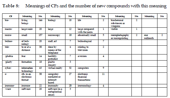 Bio- primarily combines words expressing abstractions (bioavailability), or those denoting objects (biochip), and behaviours and activities (biohacking). Only a few bio- compounds involve people (biohacker), and none refers to animals. Macroand micro- display clear semantic preferences for abstractions (macromodelling) and objects (macrolens). Micro- also combines the second elements referring to behaviours and activities (microblogging). Techno- strongly favors the combination with the second elements representing abstractions (technocentrism). Tele-mainly combines with the second elements representing behaviours and activities (telebroking). Cyber- primarily combines the second elements that belong to behaviours and activities (cyberauction), and abstractions (cybercommunity). Further data on other CFs can be found in Table 7.