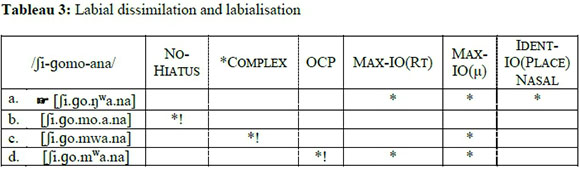 In Tableau 2, output candidates (b), (c), and (d) each incur a fatal violation of a high-ranking constraint. Glide formation in (b) results in a complex onset for V2, thus fatally violating *Complex. Heterosyllabification, as in (c), fatally violates No-Hiatus. Candidate (d) indicates that consonant epenthesis is non-optimal, as it violates Dep. Therefore, the optimal candidate (a) is that which violates the low-ranking constraints - in this case, the loss of a root node and the loss of a mora. It seems that labialisation is the optimal strategy to resolve vowel hiatus in a sequence of an onsetful rounded vowel /o u/ and another V, in this case the /-a/ of the diminutive suffix. However, in order to satisfy a highly ranked OCP constraint, a rounded V1 may be elided when preceded by an oral labial consonant. The OCP, in essence, prohibits segments with the same features appearing adjacent to one another (McCarthy 1988). When the consonant preceding the rounded V1 is the bilabial nasal /m/, a process of labial dissimilation in the form of velarisation of the nasal (see Lee and Burheni 2014 for a detailed discussion) occurs. Some illustrative examples of this are presented in Table 6 below.