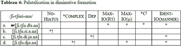 Candidate (c) is the optimal candidate, as it only incurs two low-ranking violations. Candidate (a) fatally violates *CÇ, as it involves the pharyngealisation of the first consonant. Candidate (b), which deletes V2, is eliminated by Anchor L. Finally, candidate (d), which is the faithful parse, fatally violates No-Hiatus. Elision of V1 is also evident across the stem and suffix domain, for example when the diminutive suffix /-ana/ is added to a noun stem ending on a vowel (Lee and Burheni 2014).