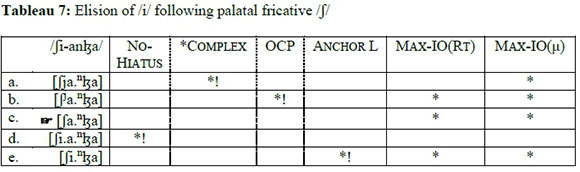 In Tableau 7, candidate (c) is the optimal candidate, as it only incurs two non-fatal violations of the two Max-ΙΟ constraints in order to satisfy the higher-ranking constraints. Candidate (a) makes use of glide formation to eliminate vowel hiatus, resulting in a complex onset and, less importantly, the loss of a mora. Consequently, it is eliminated by *Complex. Candidate (b) palatalises a palatal consonant /J7, thus fatally violating OCP. Candidate (d) is fully faithful, resulting in a fatal violation of No-Hiatus; and (e) involves the elision of V2, which in turn fatally violates Anchor L.