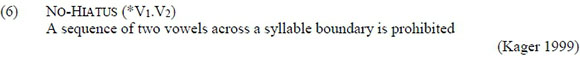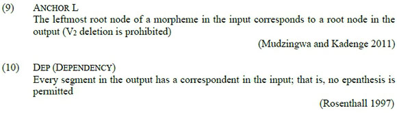 Xitsonga has a five vowel system: /a e i o u/ (Baumbach 1974; Janson 2001; van Wyk et al. 1989). The phoneme /e/ consists of two allophones [e, ε], and the phoneme /o/ can in turn be realised as either [o] or [o]. A discussion of the complementary distribution of the various allophones is beyond the scope of this article. Xitsonga does not have diphthongs, suggesting that the segmental markedness constraint No-Diphthong, which militates against diphthongs (Rosenthall 1997), is undominated in this language. This explains why diphthongisation is not a viable repair strategy for vowel hiatus resolution in Xitsonga. There will be no further discussion of this constraint in this article.