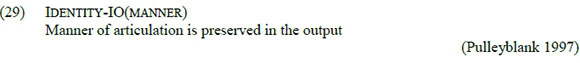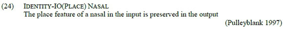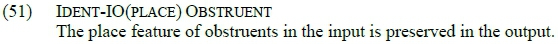 Unlike Ident-IO(place) Nasal, which is low-ranking, the identity constraint defined in (51) is high-ranking, thus prohibiting obstruents like /f/ from changing their place of articulation in the output. While Lee and Burheni (2014:97) use the segmental markedness constraint *[x] to ban the realisation of /f/ as [x], we prefer the identity constraint in (51) because it is more general.