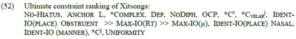 This article presented a consolidated and comprehensive analysis of vowel hiatus resolution in Xitsonga, using OT. As expected, the language conforms to the norm of vowel hiatus resolution strategies in other Bantu languages, all in an effort to satisfy No-Hiatus. Glide formation is the optimal repair strategy, as it preserves most of the features of V1. The data illustrate that /i/ becomes the glide [j], and /u/ the glide [w]. When glide formation is blocked by *Complex, secondary articulation in the form of labialisation and palatalisation is triggered. In Xitsonga, mid-vowels /o e/ also participate in secondary articulation. This is an interesting phenomenon, as it is uncommon for non-high vowels to trigger secondary articulation in Southern Bantu languages. The role of OCP is vital in Xitsonga and is often the driving force behind the choice of one strategy over another. Labialisation is tolerated following non-labial consonants, but an OCP-driven process of labial dissimilation in the form of velarisation of the nasal is triggered when the preceding consonant is the bilabial nasal /m/. Palatalisation occurs accompanied by phonetic changes in the forms /l r/ - [d] and /v/ - [b]. This repair strategy incurs a non-fatal violation of Ident-IO (manner). Vowel elision occurs as the least preferred strategy, always driven by OCP and segmental markedness demands. Deletion regularly occurs in order to prevent the labialisation of labial consonants and the palatalisation of palatal consonants. Vowel coalescence occurs in Xitsonga and takes two forms, /a + i/ - [e] and /a + u/ - [o], both of which incur a non-fatal violation of Uniformity. When coalescence cannot occur due to a disallowed sequence of /a/ and another vowel that is not /i/ or /u/, the /a/ is elided. This is because the low vowel /a/ cannot be turned into secondary articulation (pharyngealisation) or a low glide. The constraint ranking that determines the operation of hiatus resolution in Xitsonga is given in (52) below: