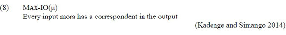 in each case presented in Table 12, the first vowel is elided completely, which results in mora, V-Place node, and root node loss. As mentioned earlier, a mora is lost as Xitsonga has no compensatory lengthening; a phenomenon found mostly in languages in which vowel length is contrastive, such as Luganda (Rosenthall 1997). Thus, Xitsonga always satisfies the markedness constraint often termed *V: (Kadenge and Simango 2014; Mudzingwa and Kadenge 2014) or NoLongVowel (NLV) (Rosenthall 1997). In other words, as is the case with ciNsenga and chiShona, *V: is undominated in Xitsonga. Given this explanation, to include this constraint in the OT analysis presented in this study would be redundant; thus the reader need only remember that compensatory lengthening does not occur in Xitsonga. Tableau 6 below illustrates the elision of /u/ in Xitsonga.