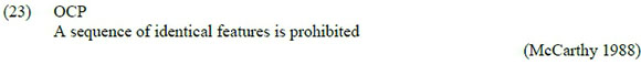 Labial dissimilation in Xitsonga is a response to an OCP-driven constraint, defined in (23) below, which prohibits the surfacing of a sequence of identical features, such as the realisation of the labial nasal /m/ as *[mw]. This constraint obviously dominates the identity or faithfulness constraint that prohibits place of articulation changes, as defined in (24).