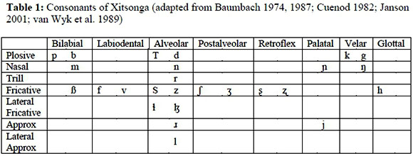 Xitsonga has a very large and complex consonant system. Janson (2001) presents 125 simple and complex consonant phonemes of this language. No minimal pairs are provided as evidence of the phonemic versus allophonic status of the sounds, but Janson (2001) claims that the richness and complexity of the language's consonantal system alone is enough to warrant treating each consonant and consonant variation (i.e. labialised or palatalised) as an individual segment. Table 1 below presents the simple phonemes of Xitsonga; complex consonants are discussed thereafter.