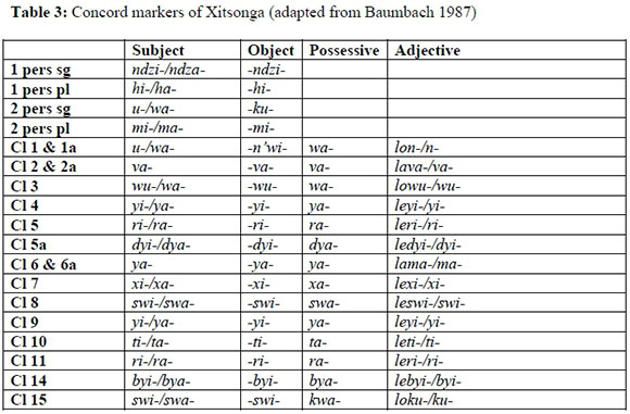 It is interesting to note that in Xitsonga no class markers are vowel-initial and there are no pre-prefixes (augments) as in Nguni languages. Moreover, concord markers play an important role in the language, as well as in the forthcoming discussion of vowel hiatus resolution strategies. Table 3 provides these, once again in their orthographic forms.