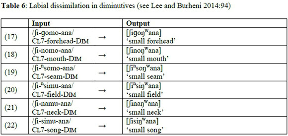 From the analysis of V1 elision thus far, it is evident that unrounded vowels are most likely to be deleted, while rounded vowels participate in secondary articulation (labialisation). Rounded vowels are only elided in order to satisfy OCP, as will become evident in the next part of the analysis. Still, in our examination of the formation of diminutives, if the stem-final vowel is rounded /o u/ and is preceded by an oral labial consonant, the round vowel (V1) is deleted (see Lee and Burheni 2014 for detailed discussion). Table 14 provides examples of this particular instance of V1 elision.