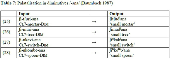 From Tableau 3, it is evident that labial dissimilation and labialisation are viable repair strategies in Xitsonga. The winner, candidate (a), which triggers labialisation and velarisation, satisfies all the high-ranking constraints. All the remaining candidates fatally violate an undominated constraint. Of note is (d), which involves labialisation, but of a bilabial nasal. This fatally violates OCP and is repaired by labial dissimilation, as in (a). In addition to labialisation, Xitsonga also exhibits interesting cases of palatalisation. See Table 7 below for some of the examples of diminutive formation with stems ending with /l/, /r/2, /vo/, /vi/, /vu/, /mbe/, or /mbu/.3