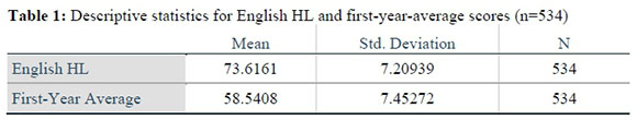Presented in Table 1 below are the descriptive statistics of the participants' performance on the English HL examination in relation to their average performance at the end of their first year of study.
