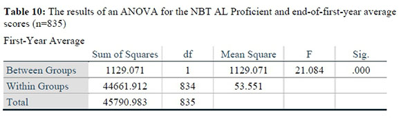 Finally, the results in Table 10 are of an ANOVA for the scores obtained by the participants within the Intermediate and Proficient bands of the NBT AL with regard to the end-of-first-year average performance.