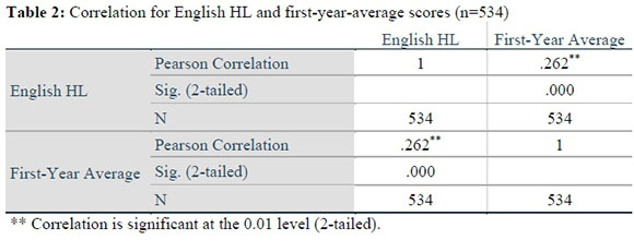 In Table 2 below, the results are captured of a correlational analysis of the participants' scores on the English HL examination and their end-of-first-year average scores.